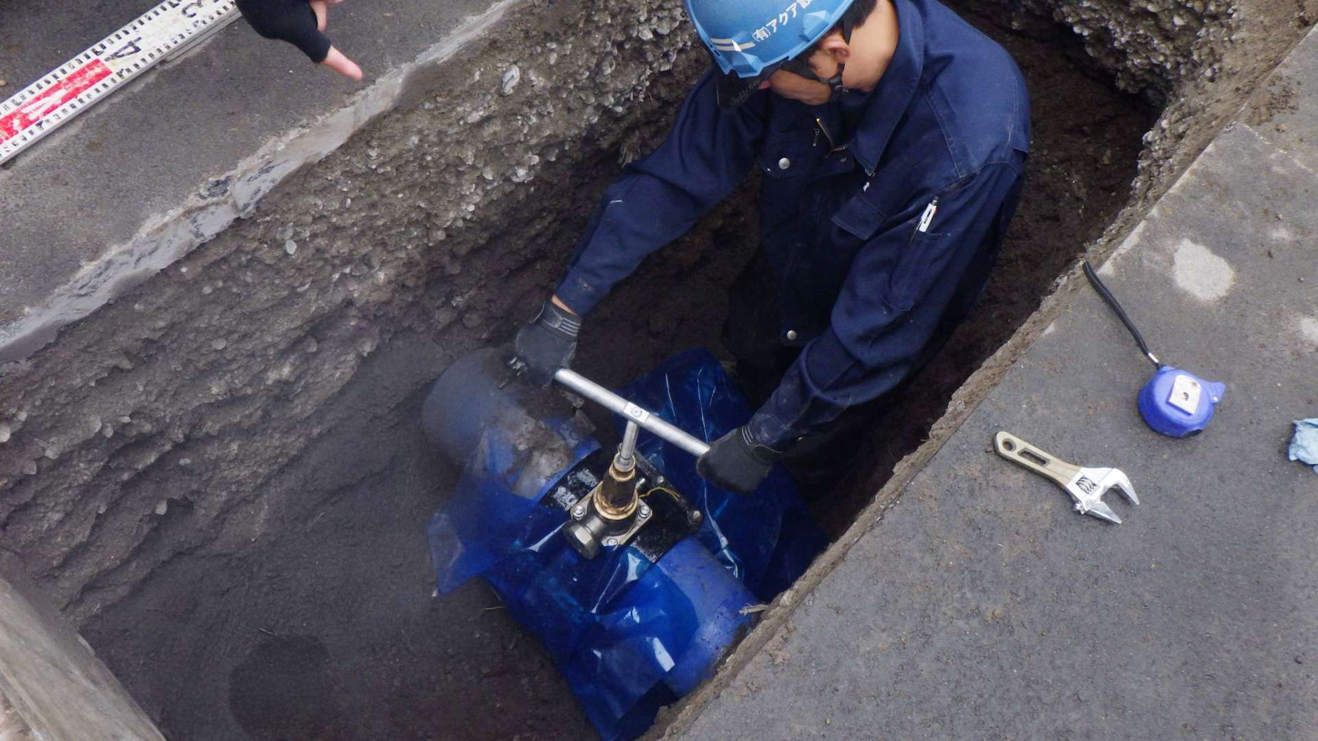 新座市内の運動場にて、トイレ新設に伴う給水管の取り出し工事を行いました。